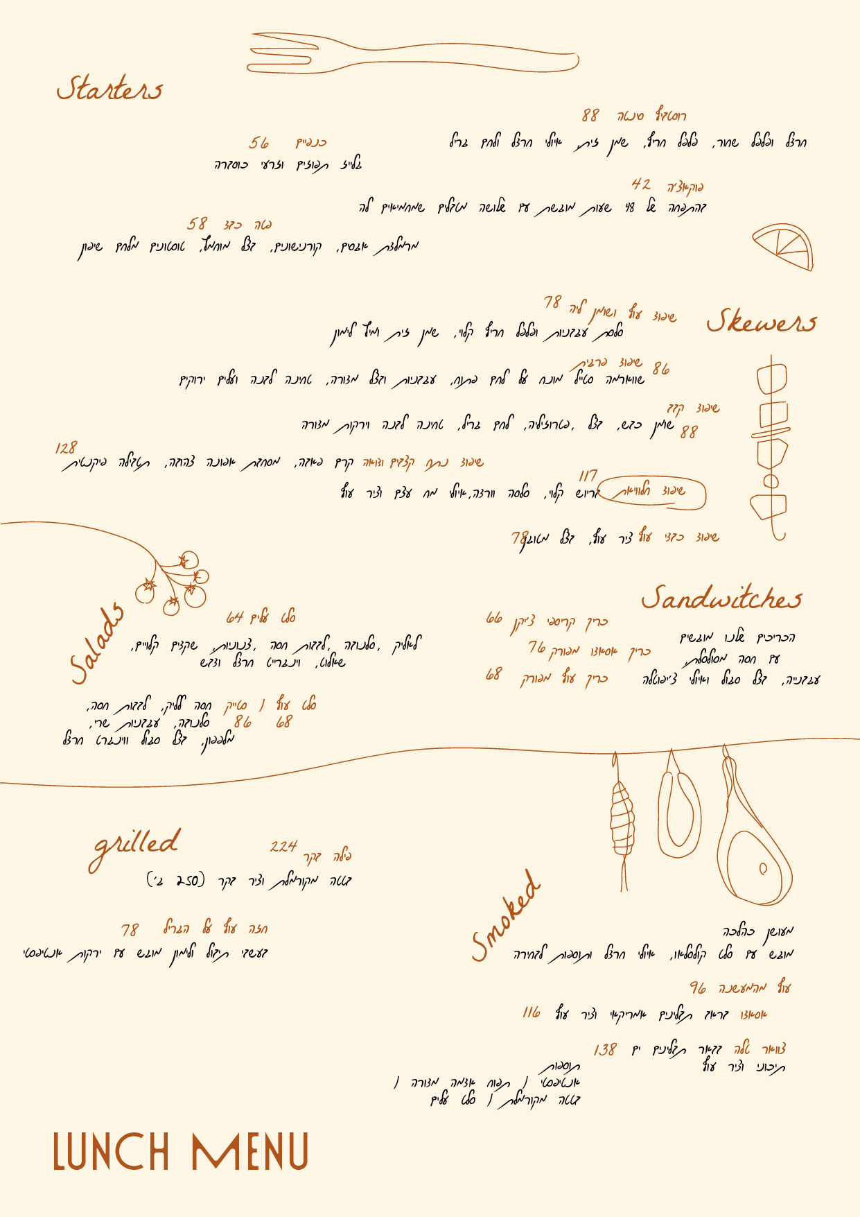 התפריט - בהובלת שף יהונתן שרביט כמובן - כולל מנות ראשונות מפנקות, תבשילים מהתנור, מעושנים שנמסים בפה, ונתחים על הגריל שמגיעים עם כל התוספות הנכונות – סלטים, פחמימות, חרדל ביתי וצ׳ימיצ׳ורי שלא צוחק.